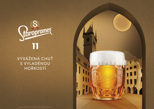 Níže popisujeme koncepční pravidlo pro rozmístění prvků v klíčovém on trade vizuálu pro extenzi Staropramen 11, jehož základními prvky jsou oblouk, pražské reálie a sklenice s pivem doplněné o slogan a logotyp.